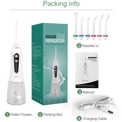 Une brosse à dents, deux buses standard, une buse orthodontique, une buse pour les poches parodontales, une buse pour la plaque dentaire et un gratte-langue, soit six buses au total. Un manuel d’instructions et un câble de chargement USB TYPE C.