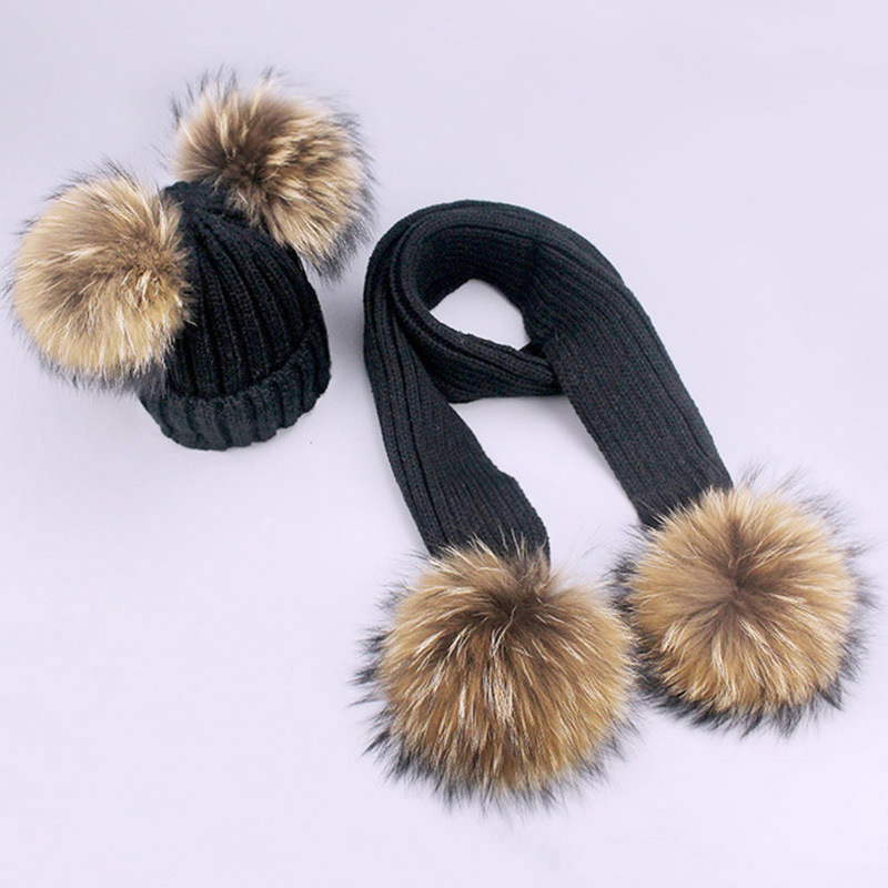 Jeu de bonnets et d’écharpes en laine à double boules de poils pour enfants